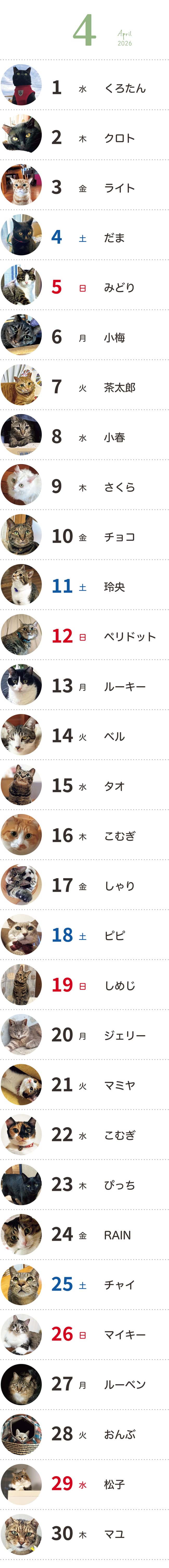 HOME | 2026年版 365日のふくおかの猫カレンダー | 4月|365日のふくおかの猫カレンダー カレンダートップページへ 1月 2月 3月 4月 5月 6月 7月 8月 9月 10月 11月 12月